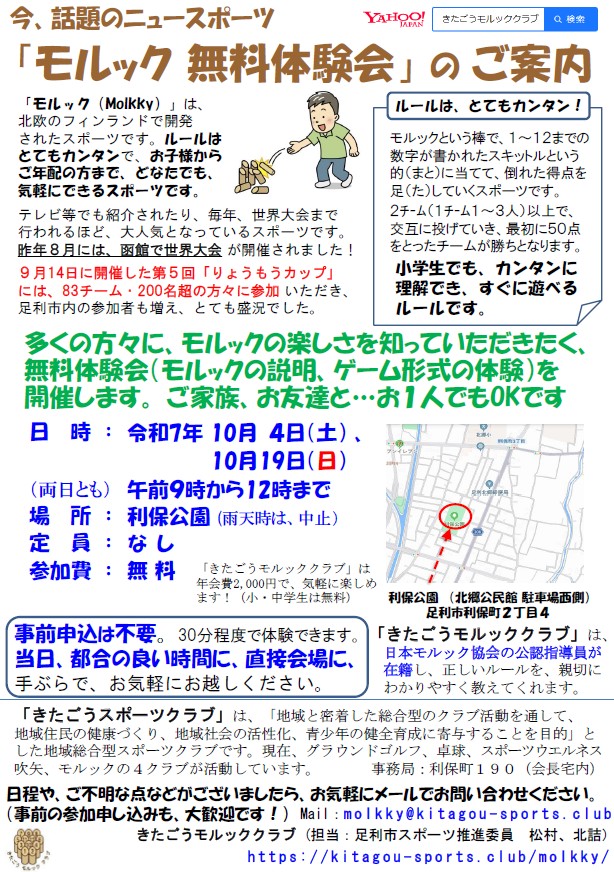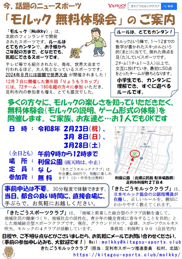 ※ モルック関連の講習会・イベント等のご相談がございましたら、お気軽にメールにてお問い合わせください。