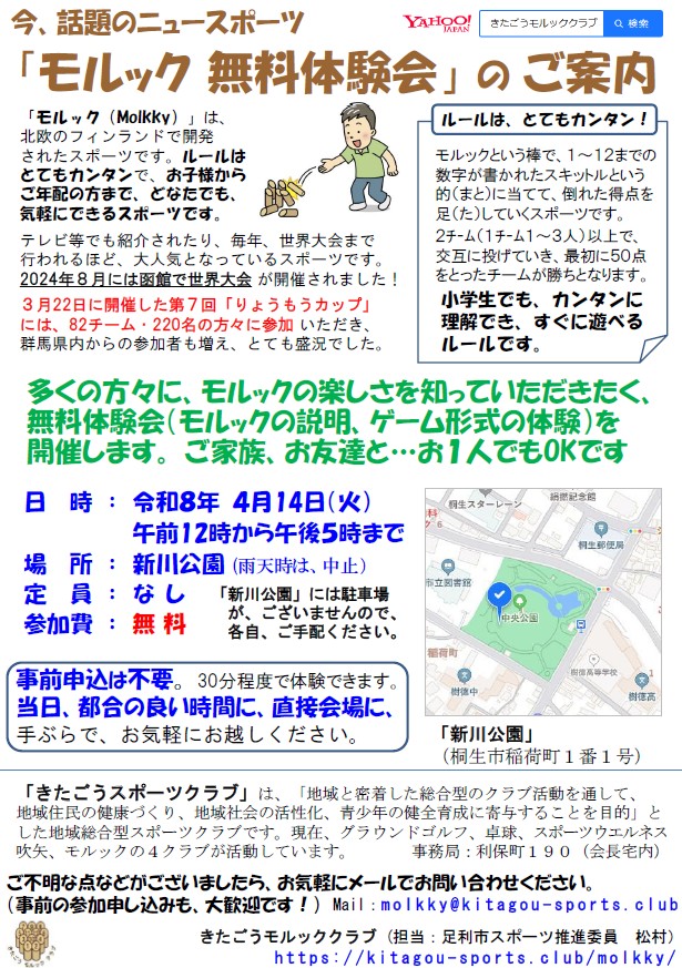 《NEW》 4/14(火)群馬県桐生市で「モルック無料体験会」を開催いたします。